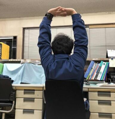 お昼の休憩。事務所の中で勤務する事務部門はみんな事務所の中でお弁当で昼食です。